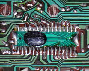 circuit bending detailsThe Playskool PS-635 is build around a single chip CPU. Mine (PCB revision "PS635, REV7") has a 32 pin DIL-shaped COB "635-21", but older versions have the same chip in a 40 pin DIL package "PWH635" with additional unused pins, those are even more interesting for modification. Thus if you want to buy one for upgrades, check the model plate at the case bottom. Mine has "SERVICE NO. P-635-B-B-(7)" and only 32 pins. Traktor ("T-150") told me that his 40 pin version was labelled "P-635-B-A-(7)".
