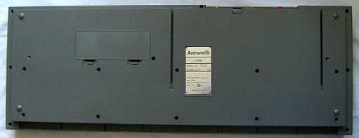 Instead of 2 MIDI jacks there is only a single 5 pin DIN jack labelled "serial in-out" and on the keyboard is a function "serial rate" that can be switched between "MIDI" and "RS232". Likely it could be connected through special cables either with a PC serial port or MIDI devices, but I haven't tried this yet. (Does anybody know more about this?) The predecessor Antonelli 2381 had only a walkman type jack for a PC serial port. I was told by e-mail that the serial port could be used with the Sound Buggy MIDI cartridge for Commodore C64 and a cassette with music learning software made by Siel.