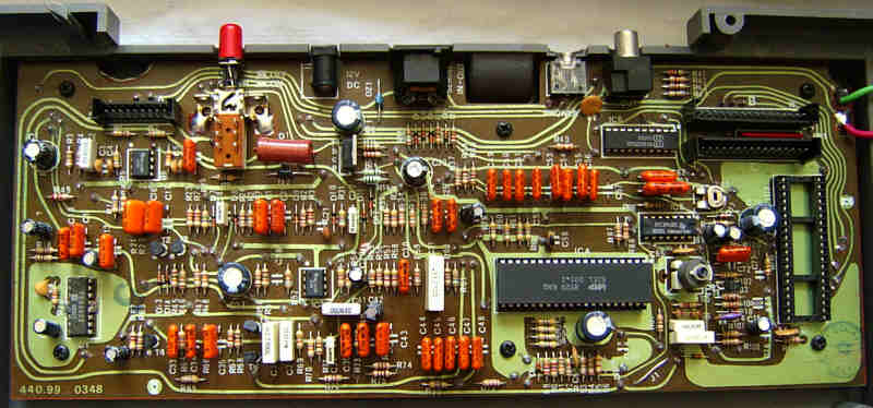The main voice presets are digital waveform samples with capacitor envelope. Although they are labelled "digital pcm presets", the timbres are still quite warm, which may be also caused by a small dose of analogue distortion (especially during chords). The volume envelope control seems to be digital, because decaying notes partly turn buzzier and stop a little sudden. The "jazz organ" is a Hammond timbre (might be a filtered multipulse squarewave) without key click. The "pipe organ" is brighter and has a slower attack phase. The "piano" sounds like a well filtered squarewave timbre and gets somewhat brassy in the bass range. The "guitar" sounds like a differently filtered variant of it, which timbre is more like a harp. The "e.piano" shall be likely a Rhodes imitation and contains some glassy aliasing(?) overtones; in the bass range it gets a little buzzy, similar like squarewave based Consonant Vowel timbres of early Casio keyboards (see CT-410V). The "strings" has a quite realistic violin timbre with slow fading attack phase and vibrato. The "flute" might be a differently filtered version of "strings"; it has the same envelope and vibrato, but a dull flute timbre which slightly resembles a theremin and resembles a tuba in the bass range. The "accord." is a quite natural accordion timbre that seem to use the same filter like "strings". The "trump." is made from sawtooth wave and sounds more like a dull and slightly creaky oboe or cello than a trumpet; it contains vibrato and resembles somewhat a C64 timbre. The vibrato modulates the sound ICs internal clock oscillator, so it always also affects the accompaniment section. With the "sustain" button the release phase of the preset sounds can be prolonged. The keyboard can be transposed within 1 octave by pressing "transp." together with a piano key.
