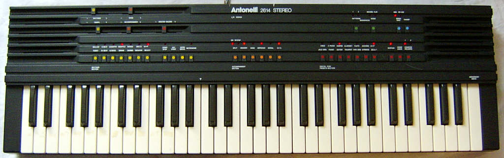 Unusual is that the demo song of the Antonelli 2614 sounds identical with 2495; other companies changed it with every new hardware class. A more advanced 2614 variant (split/ layer sounds, analogue VCF, real MIDI jacks, programmable rhythm etc.) with different sound ICs was released as Madison OK 500.