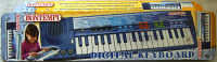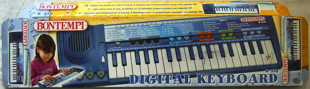This blue mini keyboard is a modern successor of Bontempi B30. Although the case looks similar, the functions are very different. It has only each 8 preset sounds and rhythms, but 14 lovely arranged polyphonic demo melodies.