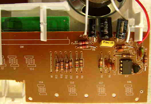 The main voice is based on low resolution samples, those sound grainy in the bass range by low sample frequency. Within the limits of their low resolution, the preset sounds are fairly realistic. The "piano" sounds like what the name suggests. The "trumpet", "flute", "violin" and "clarinet" contain a delayed 6Hz vibrato. The "xilophone" sounds a little metallic with hollow bass range; it may be rather a glockenspiel. The "guitar" may be a nylon string acoustic one. The "organ" is an electronic one, which makes a plain toot with percussive attack; the waveform is semi-brassy with grainy bass range and reminds to bagpipes. It can be described best as a beat organ. The digital volume control steals bit resolution of all sounds, which truncates the decay phase at low volume and thus can be rather regarded as a sound effect.