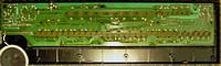The CPU pinout (clock pins etc.) hints to a 16/32 bit DSP of the documented Texas Instruments TMS320C1x family. These may be TMS320C10 (288 byte RAM, 3KB ROM), TMS320C15 (512 byte RAM, 8KB ROM) or less likely TMS320C17 (which additionally supports serial and coprocessor port and µ-law/A-law (de)compression). At the CPU 'D' pins are 2 resistor arrays for keyboard matrix pullup.