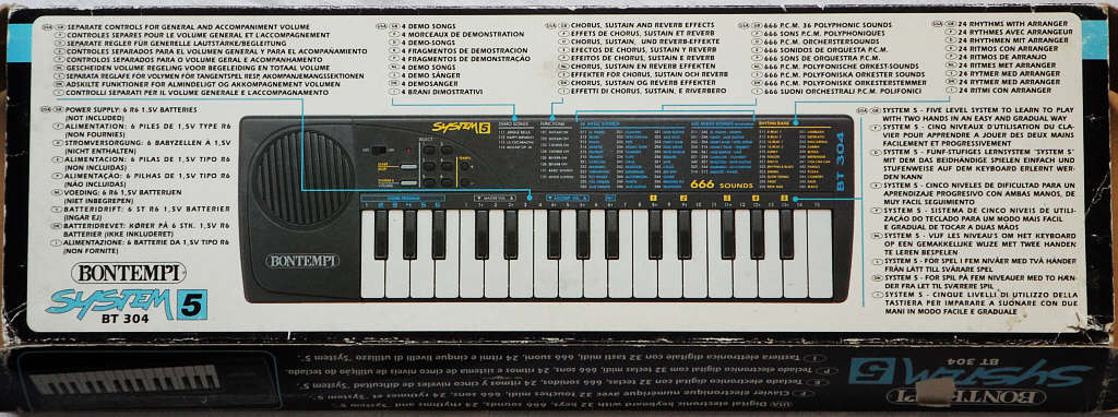 This was a cheaper version of Bontempi GT 509 without drumpad buttons. Because they also act as chord buttons, in BT 304 the 6 leftmost keys are used as single finger chord section, which shortens the melody section.