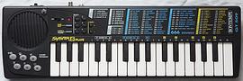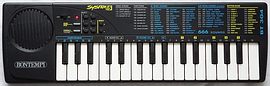 The preset sounds are quite complex and at first hear they seem to sound natural, but when listening closer, the sample based sounds are thin, noisy and a little harsh (8 bit). They seem to be made each from 2 layered waveform samples with complex envelopes and contain sustain, chorus and reverb effect those can be also manually switched on or off by numbers. (Selecting a new preset sound always switches them back to its default.) Although technically similar, the timbres are not squawky like the Casio SA-series sounds, but try hard to sound noble although partly with limited success. When not otherwise mentioned, all sounds include reverb. "Chorus" sounds (those contain 2 subvoices) half the polyphony unless the 2nd "chorus" voice is turned off. Any 2 preset sounds can be layered to achieve 666 sound combinations. The "piano" is more an e-piano, because it is made from a static waveform without chorus. "brass" is a brass ensemble. "musette" resembles a harsh accordion. "prophet" is a synth brass timbre that turns duller and brighter (wahwah chorus) while it fades silent (likely named after Prophet analogue synthesizers). The "toy piano" resembles a bright Rhodes piano (no reverb). "full organ" has a wahwah vibrato, which speed turns much slower in the bass range. "jazz organ" is rougher and harsher, and has the same wahwah vibrato. "clavinet" has here a brassy timbre with fast vibrato (6Hz, no reverb). "fifth organ" is a metal pipe organ rank chord that fades a bit duller during attack phase. "pipe" is a bright metal pipe organ rank with chorus. The "bassoon" has a slow wahwah chorus. The "mandolin" rings with a Rhodes- like timbre. The "accordion" is rather harsh. The timbre of the "harpsi" resembles a bright flute and has vibrato. "jazz guitar" is an acoustic one. "haw guitar" has a slow howling, halfway voice- like wahwah chorus effect and fast tremolo. The "jazz bass" is an e-bass with also wahwah chorus and sounds a bit brassy. The "funky bass" sounds hollow, has vibrato and resembles more a banjo. The "steel drum" sounds like made from a bright plain squarewave with chorus and percussive decay envelope (without chorus in becomes a harp). The "mute guitar" likely shall be a slightly muffled acoustic guitar (high notes resemble an e-piano). The "square" is a harsh and reedy electronic organ sound with vibrato, that resembles an accordion (with chorus off it becomes a flute). The "saw" is an even harsher and more reedy variant of this timbre (without chorus it turns brassy). The "cello" has vibrato and sounds harsh, but fairly realistic. "big ben" resembles tubular bells. "ghost" is a synth sound mixed from a fast (8Hz?) and a slow (4Hz) howling timbre that fades silent. (Both howl by about 1 semitone. Disabling chorus mutes the fast howling subvoice.) "ringing fly" is a ringing telephone bell layered with a sonorous synth piano (that has a dry multipulse squarewave timbre; disabling chorus mutes the piano). "telephone" is a electronic phone ring (a disharmonic sound made by fast toggling between 2 notes).