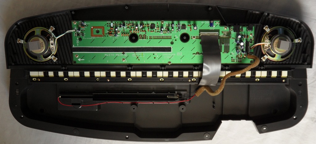 hardware detailsDespite same sound and rhythm set like Casio MA-130, the CT-840 has instead of the classic SA-series CPU M6387 an "OKI M6567-04" with 80 pins.A bit strange is that there is an unused section with empty holes on the amp PCB; possibly originally a different microphone amplifier was planned here and then left blank to circumvent a PCB design flaw; the given mic amp seems to be mounted on a small daughterboard instead. The key leds are demultiplexed by 2 octal latch logic ICs 74HC373AP.