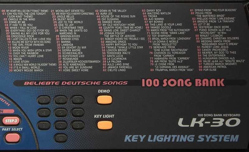 Step 1: Easy PlayThe song list of the songbank likely differs with the regional version of the LK-30. So mine has German songs including Schlager and marches etc., but there is also standard international contents.