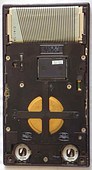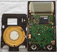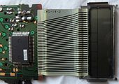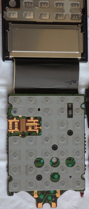 Do not remove the PCB or LCD if avoidable; the foil cable is fragile and in this model has no reinforcing adhesive film on the opposing side of the connector. The big black plastic plate (stabilizer) can be unscrewed and lifted off (be careful with the speaker wire). The stabilizer must be screwed properly on top of the PCB to prevent the case from flexing; else buttons get stuck or fall in when pushed to hard. Thus for tests only press them very lightly if the stabilizer is not in place. The PCB is held with 2 additional tiny black screws. After lifting it up, also the LCD metal frame can be carefully lifted out (not at the cable!), starting at its lower rim. caution: The LCD foil cable is fragile. Never pull at it (it may snap off) nor sharply fold it (carbon traces crumble off). Handle it with extreme care. (If the cable comes loose at an end, install an adhesive foam rubber strip to press it on.) The upper tabs of the LCD metal frame must be inserted under the plastic rim, then the bottom end carefully pushed down.