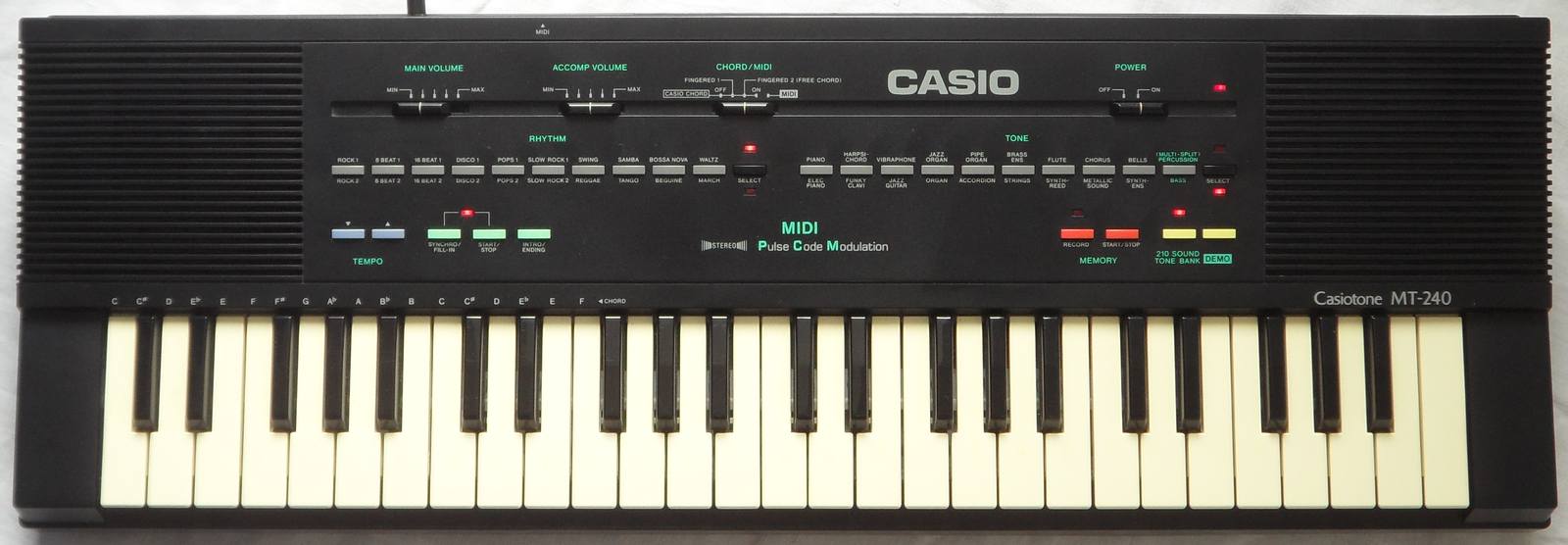 The same CPU and ROM like MT-240 was used in the lower keyboard of Casio DM-100 (the likely world-only dual-midsize-keyboard instrument, seen in service manual). Other MT-240 variants with 10 preset sound buttons (210 tone bank) were released as Casio MT-260 (aka Hohner PSK15 in white, large "Tone Bank" list), Casio MT-140 (aka Realistic Concertmate 750, mono). Also the lower keyboard of the Casio DM-100 had this sound hardware (no MIDI, upper keyboard resembles Casio SK-8 main voice). Fullsize variants were apparently the CT-370/ CT-380 (49 keys, mono, no MIDI), CT-607/ CT-615 (61 keys, mono, no MIDI) and with 15 preset sound buttons the CT-640 (61 keys, 465 tone bank, aka Hohner PSK50 in white). These have no preset sound "sound effect" 1..2 and the rightmost 4 semi- OBS sound buttons are {flute, chorus, bells, percussion | synth-reed, metallic sound, synth ens, bass} (seen on Casio CT-370). Another 210 tone bank variant may be CT-420 (49 keys, demo "Ballade Pour Adeline", aka Hohner PSK35 in white with black "Tone Bank" list) and its mono version CT-390 (aka Hohner PSK25 in white). Likely an MT-240 with 61 midsize keys, 15 preset sound buttons (465 tone bank list) and different ROM was released as Casio MT-740 and fullsize as CT-650 (aka Hohner PSK55, white, different ROM seen in schematics). Likely a variant of this was CT-636/ CT-638 (rounded case, only 3 switches).