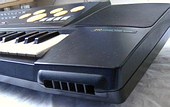All main voice sounds employ a mild stereo chorus effect and a dose of reverb those can not be turned off. There are also neither sustain nor vibrato controls on this instrument and many preset sounds contain annoyingly long sustain. The sounds are genuine stereo (with different panning positions, not just a rotary speaker simulator) and apparently the sound generator employs oversampling because low notes turn duller (like with FM keyboards) and not rough and grainy like with most cheap sample based lo-fi tablehooters. Thus the preset timbres have high tone quality and sound fairly noble although not all of them are realistic. The sampled "piano" sounds astonishingly real and has about 7 split zones (much more than I found on other average home keyboards); you can even well here the woody knocking hammers with higher notes. (Only velocity is missing.) The "harpsichord" rather reminds to a funky clavinet or slap bass in the bass range and like many other timbres here it sounds a bit reedy and of plastic in the mid range, but it still sounds nice. The "funky clavi" is duller and especially has a dull bass range and reminds more to a fuzz distorted lead guitar (also with plastic mids). The "elec piano" has sustain and a slightly squawky timbre (semi- metallic, Rhodes imitation?, also a bit guitar- like with brassy mids); in the bass range a split zone makes it very dull (like a down sampled xylophone?). The "vibraphone" sounds nicely realistic (with 6Hz vibrato); the bass range is quite dull and woody. The "jazz guitar" is more a dull electronic organ timbre with mild tremolo (chorus effect?) decay envelope and dull bass range. The "jazz organ" is a slightly hollow Hammond imitation with percussive attack and mild chorus, while "organ" reminds to a clarinet or wooden pipe organ rank or the "synth reed" found on SA-series keyboards; it has chorus, a dull bass range and slightly longer reverb. The "pipe organ" is a bright metal pipe organ rank timbre, that reminds to the famous multipulse squarewave timbre, but is brighter, has chorus and a duller bass range, which makes it sound more like a transistor organ with a small dose of leslie and sustain; unusual is that volume decreases during the first 0.5s. The "accordion" sounds a bit of plastic in the mids, but otherwise quite natural (with semi- woody bass range). The "brass ens" sounds not at all what the name suggests, but is a thin sounding reedy plastic timbre with strange scratchy attack phase, chorus and a 4Hz vibrato that continues during its fairly long reverb. Possibly it is made from sawtooth waves; it has much similarity with certain thin C64 timbres; especially the (duller) bass range reminds to C64 organ bass sounds. (This sound has nothing to do with the famous SA-series "brass ens" but resembles rather "pop lead" on SA-series or the "magical wind" sound on Casio CZ-230S.) The "strings" fades louder and then quieter during the first second before it holds with fluttering tremolo. The timbre is a little bright and thin and even slightly resembles the bizarre "cello" on Casio CZ-230S although it lacks the drastic timbre change; the trebles have something of a mosquito, and there is a 2s long sustain (which often disturbs). The "flute" has a delayed 4Hz vibrato and while high notes resemble a metal flute, low notes are more like dull woodwinds. The "chorus" attempts to simulate a human choir, but the timbre is more like a dull synth brass chorus with slow attack and fluttering tremolo; the bass range is very dull. The "bells" is a grainy lo-fi timbre of long clanging church bells with a very long echo of repeating clangs (over 10s!); lower notes sound dull and disharmonic. The "synth ens" is a slightly sitar- like bright timbre with decay envelope, 6Hz tremolo and long sustain; the bass range sounds grainy and woody (reminding to some Miracle Piano timbres). The "bass" is a key split sound with a dull e-bass (or nylon guitar?) to the left hand and a funky hammering fat slap bass to the right hand. Great is that when a key is trilled, each new note occupies a new sound channel, which produces a great phasing sound and volume increase effect although this eats up polyphony. Like with many other MIDI keyboards, pressing semi- OBS preset sound buttons with held notes does not affect them in any way but only changes the sound of newly played notes (this can be also used for play tricks, especially with "sound effect" sounds).