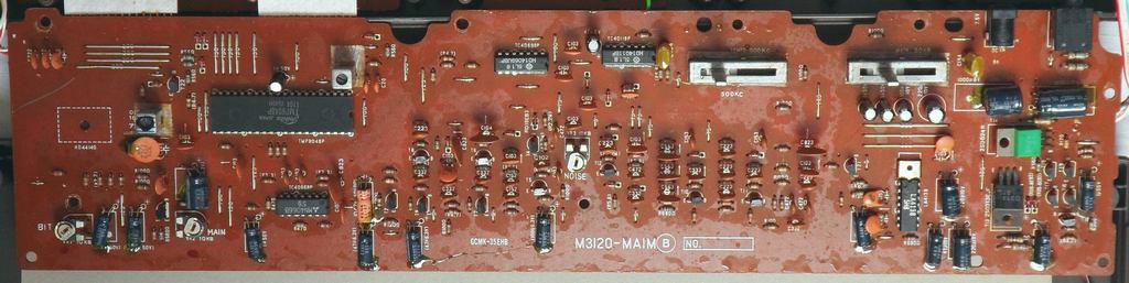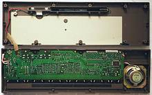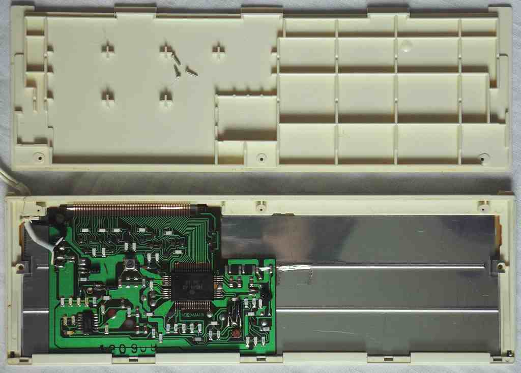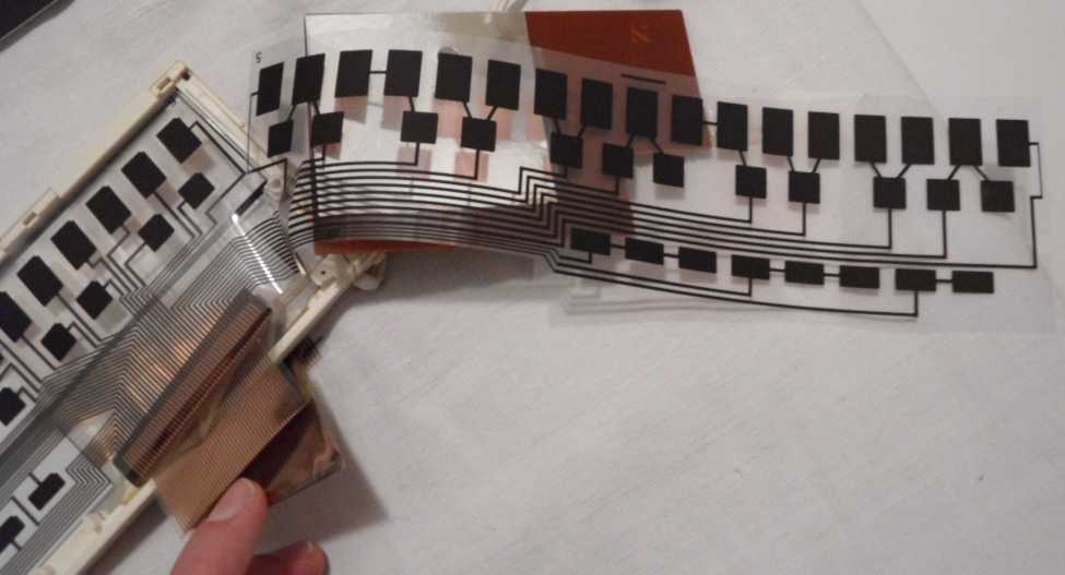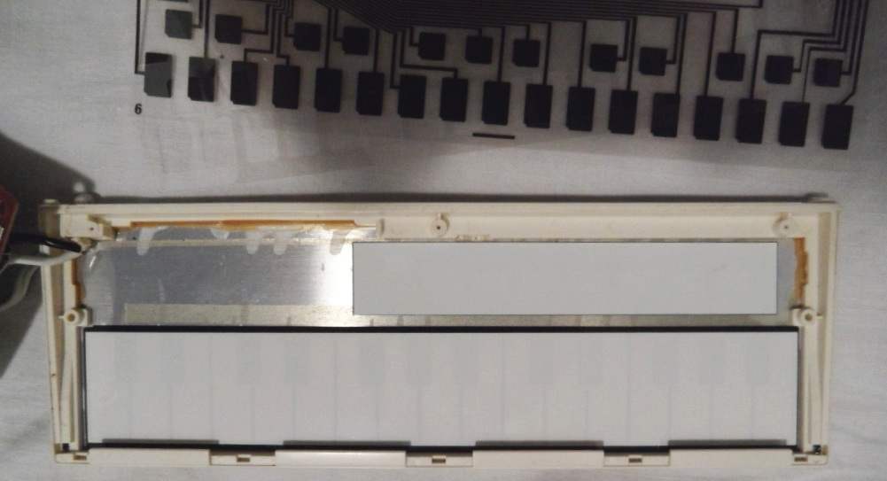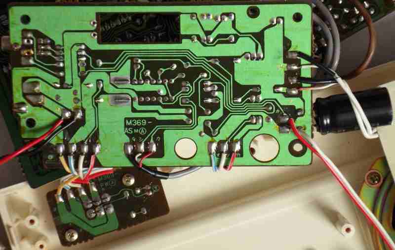 A lot of wild random crash sounds can be generated in my MT-40 by adding a shitshot button from pin 3 of the D8048C (for safety through a 1 kOhm resistor) against GND, which likely works also with the PT-7. keyboard unitBeside some other unused pins (anyway GND) wired to GND and the LC oscillator, the HD44140 is not wired that much differently than in Casio MT-45. A little strange is that the key matrix diodes were substituted with small SMD transistors (each used instead of 2 diodes) those have different types (pinouts) to minimize the use of bridges (the unmarked white resistors).caution: The sensor keyboard case is held closed by 3 tiny screws and 4 plastic tabs; to open it it is important to pull the plastic cover backwards (in the direction of the cable hole); do not bend it upward because this would crack off the plastic tabs. Be generally extremely careful with dismantling this delicate component. When open, the PCB hangs only on 2 strips of adhesive film and the foil cable. Danger!: The conductive glue under the foil cable is extremely brittle and will break by any small sideways motion or rotation of the PCB! My cable fell off without warning when I only tried to turn the ferrite core of the tuning coil (after 2 hours of successful measurement). It is impossible to remelt this glue by heat!