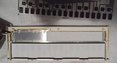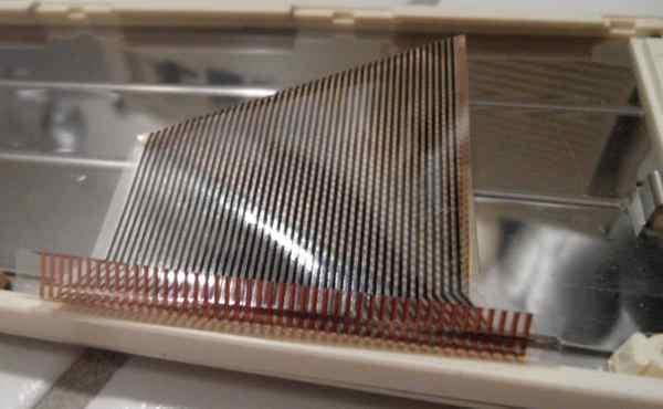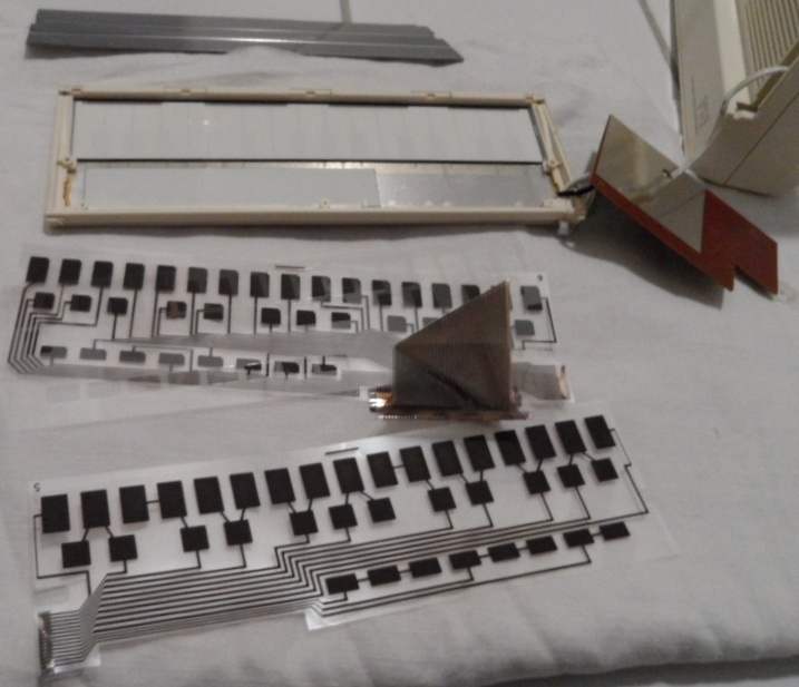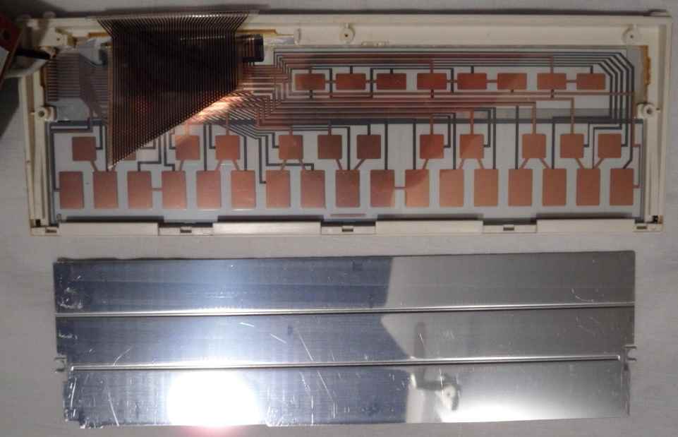 caution: Never play with sharp, spiky or rough objects (like finger nails) on the sensor keyboard surface - the foil may get damaged easily. At both keyboard sides the grooves for the 2 small metal hooks were filled with a smeary, tar-like substance, that sticks to the hooks and left black dirt stains everywhere. I suspect it was decomposed residues of wrongly mixed black rubber. (I found similar goo in Yamaha MP-1.) I used tissues, cotton swabs, a cable tie and a bit of isopropanol (do not soak the foil) to poke out and clean up most of it.