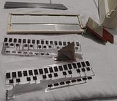 At the left side of the package is an unused short pin stub that is internally connected with +Vs (positive supply voltage) and apparently not counted as a pin. At the opposite side is no pin at all. The "NC" pins are unconnected, behave like inputs (high resistance) and have lo level. Pulling these to +Vs through 1K resistor seems to do nothing. It is unknown if some of the many pins wired to GND or +Vs are genuinely inputs or test pins. I see no complex signals for communication with a host CPU; likely the HD44140 is too dumb for this or interesting pins are just grounded. When shitshot (touching clock pins) it does nothing spectacular (sometimes stuck notes or silence or plain notes decaying naturally, but no new timbres), which hints that is a rather banal LSI circuit of hardwired logic gates and counters (even simpler than D77xG) with next to no software inside. Also the strange keyboard matrix layout (16 x 3) was likely done to simplify internal wiring. The PT-7 powers on with 'harp' preset sound, but MT-21 (slide switch in intermediate position) defaults to 'piano', thus I guess that in PT-7 external components (a capacitor?) set it to 'harp'. An obviously related real sound IC by Casio (controlled by a CPU, with
