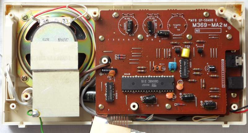 circuit bending detailsThe Casio MT-21 is built around the main voice CPU HD44140 and uses all its features (no matrix eastereggs). The rhythm is controlled by the unique accompaniment CPU "Toshiba TMP8048P 1104" (Intel MCS-48, variant of "NEC D8048C-316").