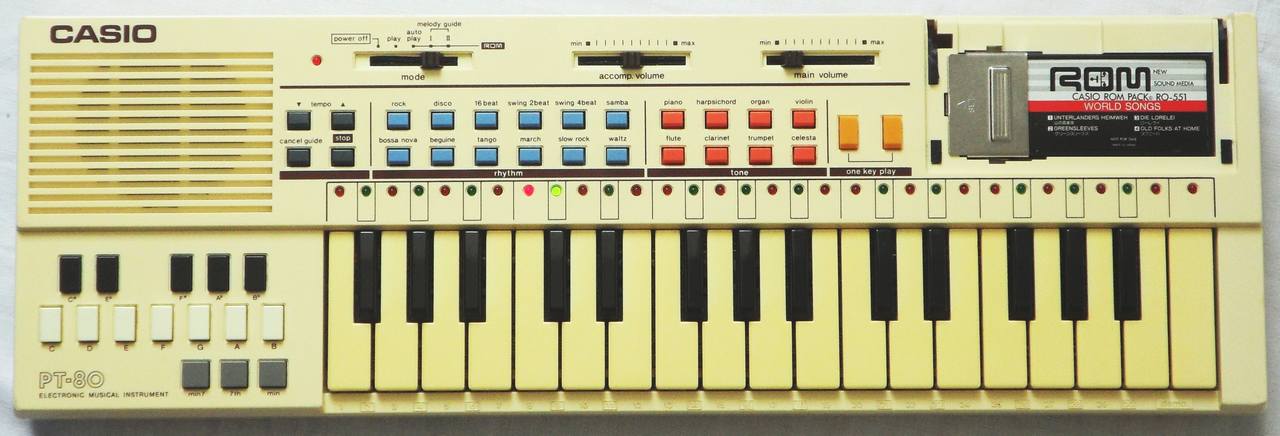 A direct successor of the PT-80 was the technically simplified Casio PT-82 (which unfortunately lacks chord buttons and has boring blip drums).
