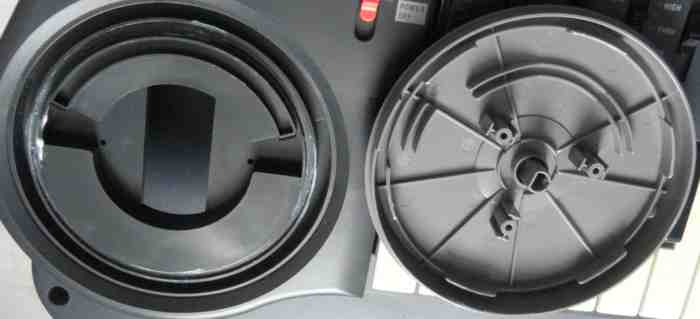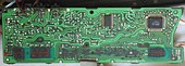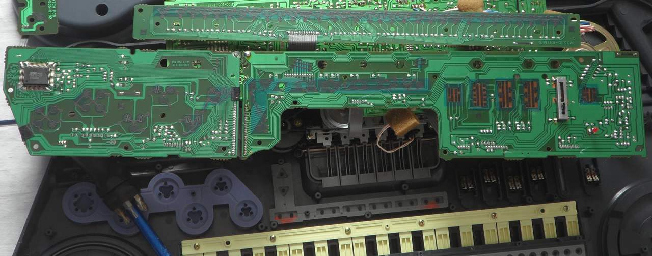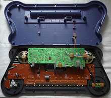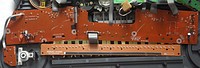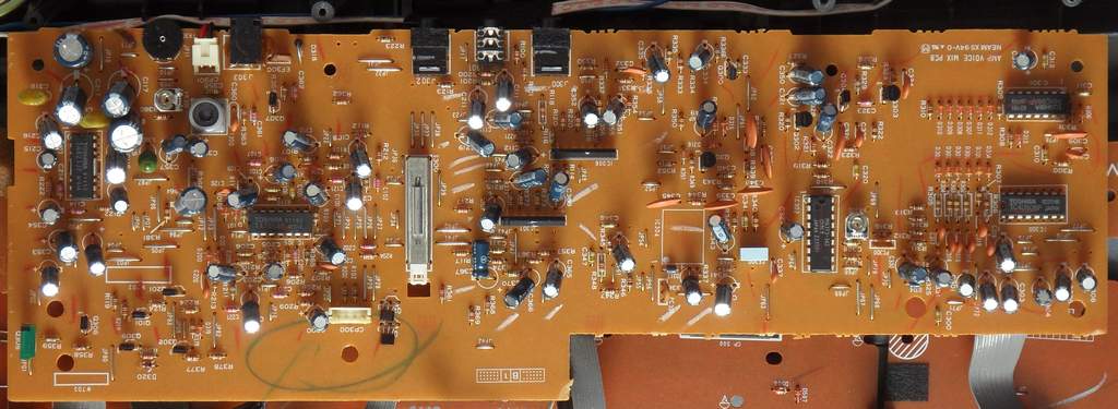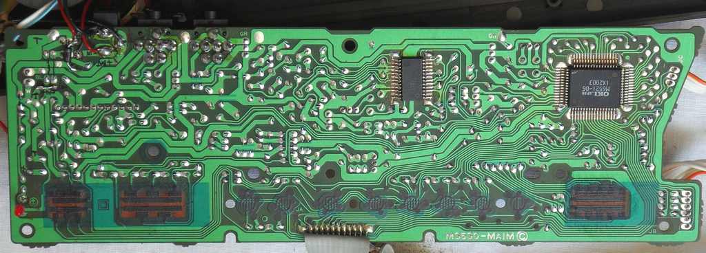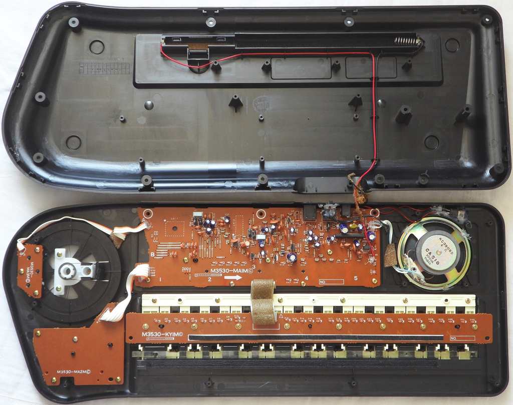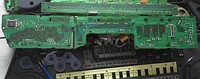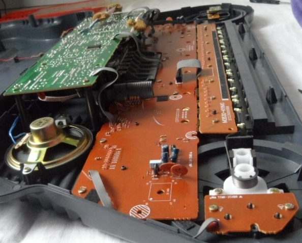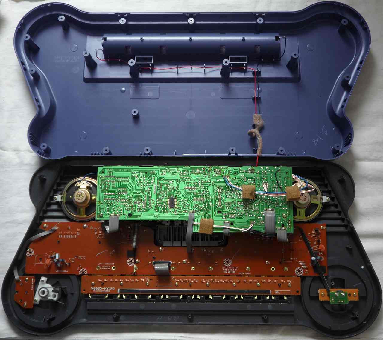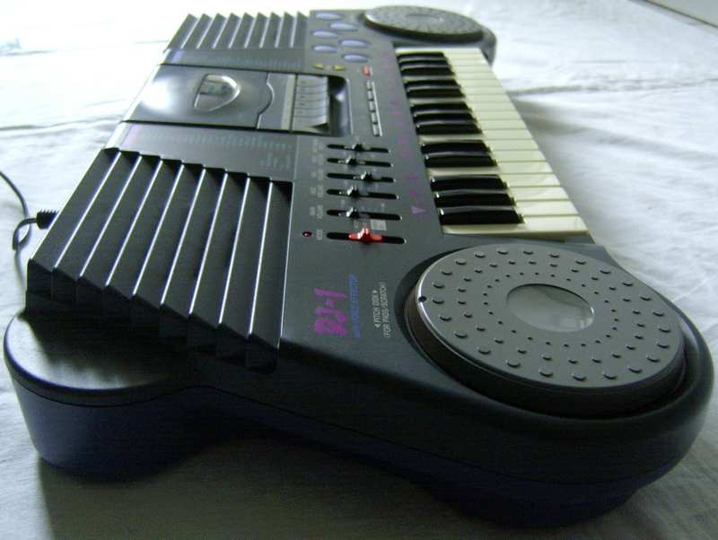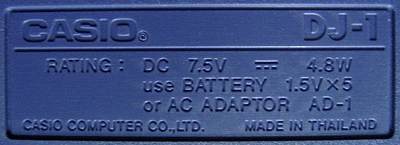 hardware detailsThe Casio DJ-1 is built around the CPU "OKI M6521-09" (crystal clocked at 21.725 MHz). But drumpads and right scratch disc are handled by a selfcontained sound IC "OKI M6373-342" that has no digital connection with the rest. Its clock rate is controlled by the potentiometer of the left scratch disc. Also the voice changer IC "OKI M6322" is clocked by its own 4 MHz crystal and runs independently.