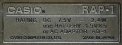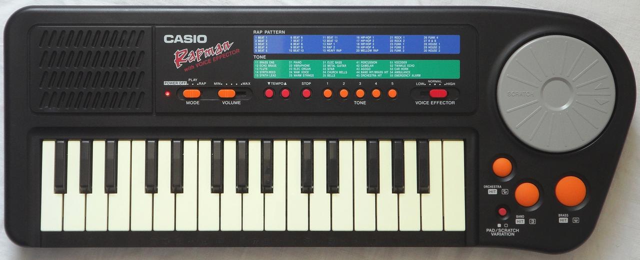 In the Rapman series Casio also released a boring belt- mountable rhythm/ scratch sound toy without voice changer named RAP-10. A much bulkier Rapman-like keyboard (with cassette recorder) was Rap Studio RAP-2 that is better known as Casio DJ-1. A blatant RAP-1 knockoff was the First RAP-2 (similar case and accompaniment, no voice changer, squarewave sound + short rap/ percussion samples).