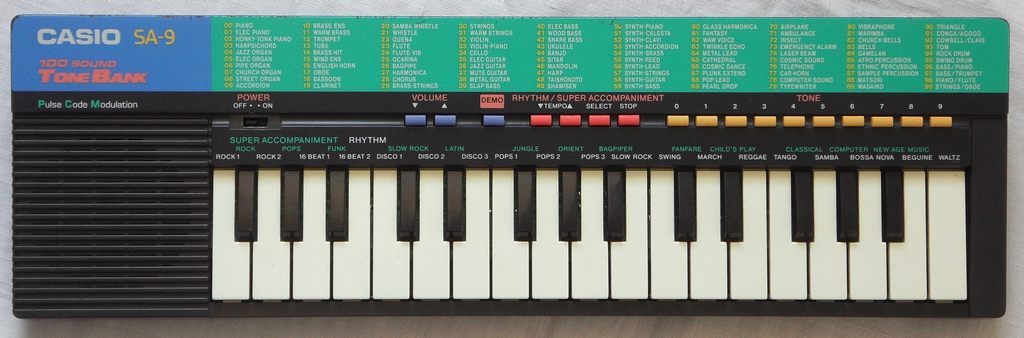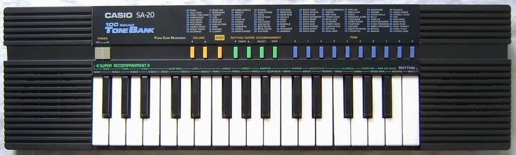 The Casio SA-series ToneBank keyboards were the first cheap sound bank instruments with up to 100 PCM preset sounds based on samples using a single-chip CPU. They were initially released as competitor to the Yamaha VoiceBank FM instruments those also had up to 100 preset sounds. The variety of cold echoey synth timbres full of reverb have a typical late 1980th new wave appeal. The SA-series was the first complex softsynth on a chip.