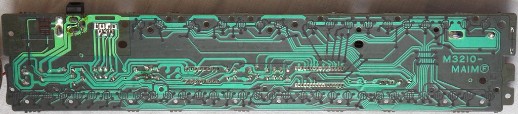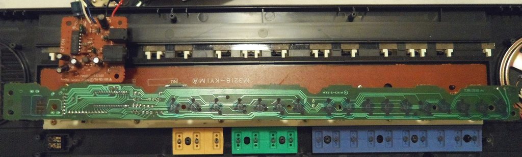 The keyboard matrix inputs are active-high (react on +Vs aka VDD). The count of active KO lines depends on the software number, thus higher KO lines may be unused (NC) in certain CPU versions. SA-series only have 7 or 8, but I found 10 in the MA-130. My only keyboards using all KO lines are GZ-5 and SA-65. Both have a more complex discrete clock oscillator with COS0 unused. GZ-5 uses KO11 for MIDI-out and the rest for keyboard matrix. SA-65 uses KO8..KO11 to communicate with its LCD display controller IC "KS0035". Unusual is that the SA-series (and GZ-5) has its piano keyboard matrix grouped by 8 while those of most Casios are grouped by 6 (i.e. 2 per octave). In 32 keys instruments (except SA-40), during startup (power-on reset) the M6387 CPU pulls KO7 (pin 23) high while it polls KI7 (pin 18). If both pins are connected, it will detect this pulse and enable higher polyphony; else it will limit polyphony to 2 notes. Then it sets KO7 low again to avoid blocking the input. Thus to enable higher polyphony, you have to connect pin 23 with pin 8 (permanently or only at boot time). In keyboard models those use KO7 also for the key matrix (if yes, you will hear a beep when you hold an 1k resistor between pin 5 and 23) you need to connect them through a diode to avoid matrix bugs. In keyboards those don't, you can simply connect them directly. However to prevent polyphony bugs, for polyphony >2 notes, a diode needs to be wired in series with each key (from an output to an input). This upgrade would be mechanically very difficult (involving trace cutting and likely SMD diodes) because small SA-series keyboards use a narrow multi-layer PCB with carbon trace contacts, where 32 additional diodes are very hard to fit (unless you anyway install an external keys PCB or MIDI kit). Thus in practise this is not worth the effort, because the corresponding midsize models with higher polyphony are quite cheap and easy to find on eBay. If you like, of course you can also do the opposite and install a switch into a given connection between pin 23 and pin 8 to reduce the polyphony to 2 and though make melodies thinner. To test if your version supports it, simply short pin 23 with GND during power on; it will suppress said pulse and so switch to 2-note polyphony. (Don't do this regularly; the overload may harm the KO7 output, thus better cut the connection between 8 and 23 and replace it with a switch.) The same mechanism exists in M6521 based instruments like Casio PT-88. advanced successorsIn keyboards with key lighting or ROM-Pack support (like ML-2, PT-88, CT-840) SMD variants of the M6387 were used to permit higher pin count.OKI M6521The "OKI M6521-xx" is a 60 pin SMD variant of the M6387 that (unlike older Casio keyboards) supports a matrix of key lighting LEDs without the need of driver transistors and can control a ROM-Pack port. Without a ROM-Pack connected, the key lighting uses demo songs from its internal ROM. Like M6387 it is clocked at 21.725 MHz. Polyphony is up to 6 notes. For pinout see here.OKI M6567The "OKI M6567-xx" is an 80 pin SMD variant of the M6521 with even more pins, that is clocked twice as high (43.45 MHz) to support double polyphony (8/16 notes), a chord sequencer (100 chords) and LCD display. It was used e.g. in CT-840. For pinout see here.OKI M6755The "OKI M6755x-xx" (100 pin SMD) is only loosely related to SA-series. Its algorithmic effect sounds noticeable differ, and it is unknown if technically this is a member of the family at all, since it has lower clock rate (20 MHz) despite 12-note polyphonic stereo sound, however it is the only variant with midi. It was mainly used in fullsize songbank keyboards (often with keylighting like LK-30). |