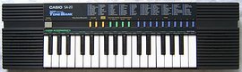 The same sound style but with the subject more on algorithmic synthesizer patterns instead of natural instruments are the Casio SA-5/ M-100 (polyphony 2 notes, mini keys) and Casio SA-35/ M-200 (polyphony 4 notes, midsize keys). These great keyboards are almost synthesizers because their 100 preset sounds are sorted into groups with "tone edit" variation button and the pattern speed and timbre can be drastically changed by the digital volume control.