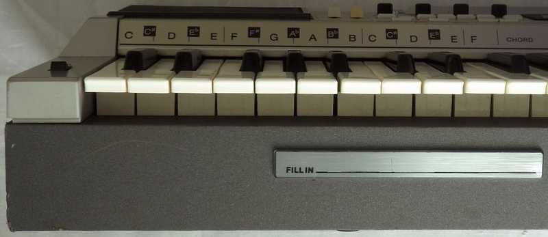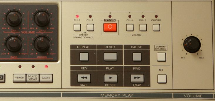 The manual proudly boasts: "Dual Keyboard Function - By using the effect memory with manual play, you can change the sound, effect, sound location and volume of the melody with a press of a button. It's as though there were two keyboards in one..." But this is less exciting than it sounds. Despite the instrument contains 2 copies of the entire main voice sound hardware (sound-IC with filter and analogue parts), preset sounds can neither be split nor layered on keys. but only in the sequencer. By hand you can only play one of 2 registrations. For this press "tone effect CH-1", select the 1st preset sound, press "tone effect CH2" and select the 2nd preset sound. Their ratio can be varied with the CH1 and CH2 volume knobs. The tone effect buttons so can quickly switch between these 2 registrations (including vibrato, sustain, pan mode etc.) but not place them simultaneously on the keys.