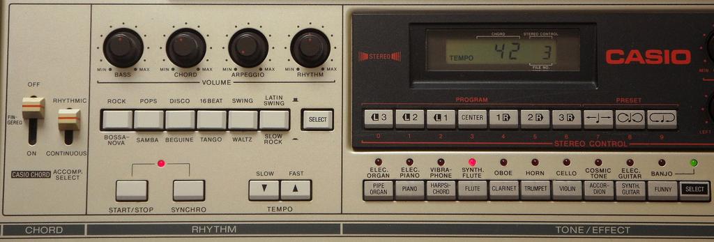 The main voice and percussion resemble Casio MT-65 but lacks the many sound variations of the latter but only supports delayed vibrato. Also accompaniment is simpler, but at least rhythm can be used with manual chord ("continuous") mode which always holds notes (chord memory), and it has arpeggio.