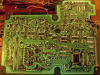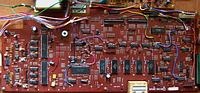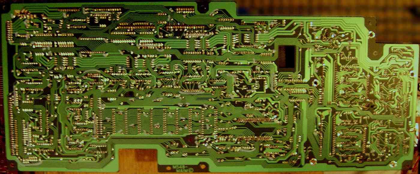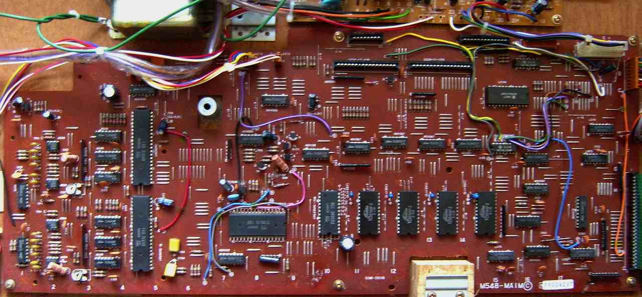 The main CPU controls the D930G 11 apparently by simulating keyboard matrix inputs (which hints that there is no secret internal protocol). For this the CPU does not read its matrix outputs (KC1..KC10 are not used) but syncs with it and sends signals to the KI pins. Strange is that D930G pin 31 is wired hi through an 1k resistor, which may inform it about the absent sound IC or even change the data format for being controlled by an external CPU. (Casio Symphonytron RC-1 with similar configuration does this too.) This looks like a model select feature, and the 1k resistor hints that pin 31 can also act as output. The CPU data bus is latched through flipflops clocked by address line A3 during I/O access. (Logic gates are wired to CPU pins A3, IO /M and /WR to implement function "OR(NAND(A3,PC5),/WR)" The same logic is used in many places to select things by other address lines.) PA7 (RES) -> I1 (SCH)