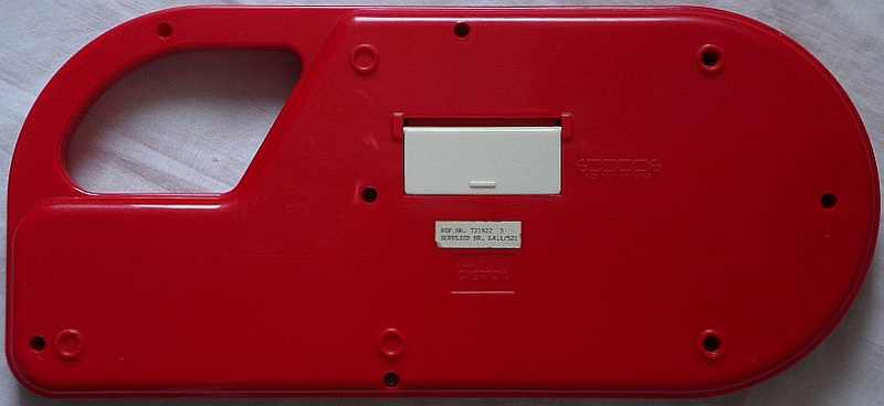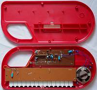 This red toy keyboard from 1990 (embossed case date) has a handle and blue, semicircular speaker, but there is no name on it. It plays 8 fantastic, grainy POKEY-style rhythms. Main voice is plain squarewave, but well playable.