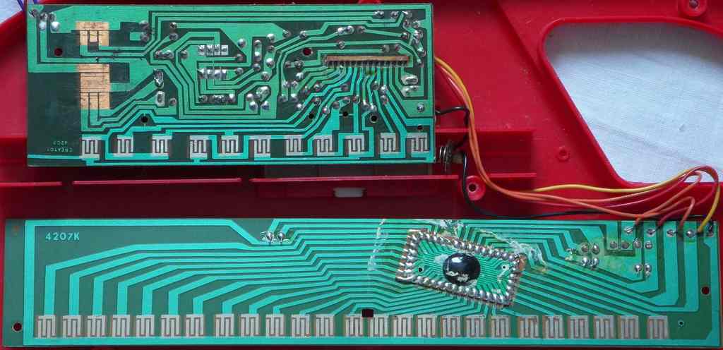 hardware detailsThe Creatoy 4207 keyboard is build around the main voice CPU HT3250 (unlabelled 40 pin COB) and rhythm CPU "3080" (15 pin COB, HT3080), those do not communicate with each other. Downloaded datasheets reveal that both were made by Holtek.