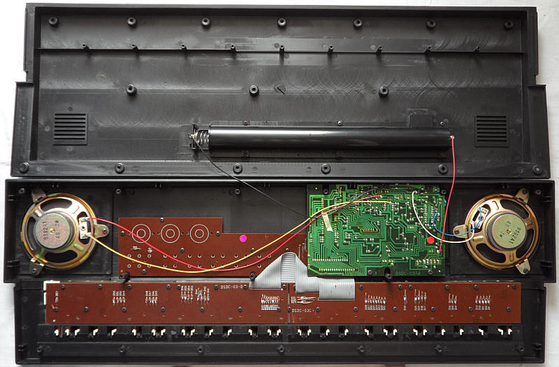 envelope controlThe analogue envelope control in SC-MC-22 is more intelligently programmed than in MC-2 and so uses the length pins (18, 19) also to change the note length of decaying sounds according to the key press duration. The length pin of an unused 2nd channel stays always lo. In all preset sounds except 'cowbell' during decay the tone is shut off after 0.5s (which is sufficient for the employed capacitors). Preset sounds those play an octave higher are only monophonic; possibly the CPU was considered too slow to render them properly on 2 channels. However the split sounds can combine 2 of them, which makes this less likely (unless the keyboard scanning gets faster when each halve is monophonic).