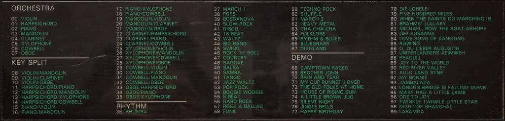 The single finger accompaniment alternatingly plays envelopeless plain squarewave organ bass and duophonic sort-of chord notes (i.e. no real 3 or 4 note polyphonic chords). The accompaniment recognizes only 3 standard chords and with accompaniment only monophonic main voice play is possible, but at least it recognizes chord changes reasonable fast. The accompaniments have a cute and cheesy orchestrion or fairground organ appeal and the 32 available styles also include many unusual patterns beyond waltz and tango.