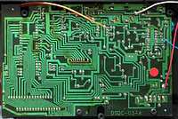 The envelope behaviour of the "SC-MC-21" CPU is fully identical, except that its hi octave preset sounds are not monophonic. rhythm & accompanimentDespite there are enough CPU pins and the percussion IC "82100"contains 4 samples, in MC-2200 the 'cymbal' is neither used nor connected. I suspect that (like in Casio VL-1) the limit of 3 percussion sounds was done to save rom space by encoding rhythm patterns in 2 bits per beat (3 percussion + pause) to make space for more demos, because this tablehooter was made upon a time where Casio and Yamaha already had 100 preset sounds, plenty of PCM rhythms and songbanks with dozens of demos, with those the Chinese wanted to compete despite ridiculously inferior hardware. So they decided to build a keyboard controlled by the so modern hyped cipher buttons (including that annoying button click), many accompaniments and demos, while completely ignoring polyphony or variety of sounds.Because each percussion is triggered by a single CPU pin to the percussion IC "82100", you may rewire them (including the 'cymbal') through switches to make more rhythm variations. The sample pitch is controlled by the 150k resistor R20 between percussion IC pin 2 and 3. Also the 3 accompaniment outputs certainly can be rewired for more variations of the cute squarewave accompaniment. disable button clickThe button press blip sound comes from an own sound channel at CPU pin 17. You may disconnect this nuisance if you don't like it.keyboard matrixThe keyboard matrix has no eastereggs, but here is it for comparison. Like SC-MC-2, the keyboard matrix inputs need unusually low resistance (below 1k) to respond. Places 28->35 and 29->35 do nothing (no button click) but block the panel buttons, so there are no eastereggs.