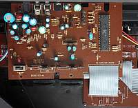 Pin 25 seems to be an unused output (fairly low resistance) that stays always lo. The unused pin 4 in SC-MC-22 outputs a trigger pulse when any other percussion pin (5..7) does the same, so it was likely intended as a handshake for a more complex percussion generator that uses pin 5..7 to address more than 3 sounds. In SC-MC-21 this is the trigger out for the cymbal drumpad. Also the chord led pin 36 and key matrix out pin 35 are not used (lo) in SC-MC-21. The accompaniment pins 23 and 24 behave odd. Pin 23 is mixed with pin 22 (bass out) through resistors. I first thought there were hidden additional polyphony channels in their signal because the resulting waveforms behind resistors are strange (and with changing notes jump up and down into 4 positions by DC offsets), but at the pins itself it is only plain squarewave. Apparently all tone generators simply stay at their level (hi or lo) after stopping instead of returning to a default level, which makes their DC offset jump around and so may produce interesting transients colouring the timbre. (Some serial capacitors keep the DC out of the power amp.) |