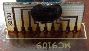 pinout 82100The "82100" (9 pin COB, by Medeli?) is the percussion IC of Elite MC-2200 and some other 1990th toy grade music keyboards. It is monophonic and contains 4 low resolution percussion samples {base, snare, clave, open cymbal}, those are output when the corresponding pin is pulled low. Holding the pin longer repeats the sample in a loop. Pitch is controlled by an external clock resistor (at clock frequency, no DC control). The clock frequency with 150k is about 147kHz.