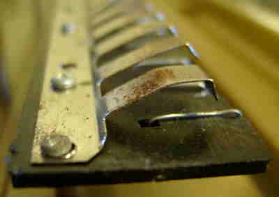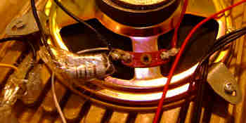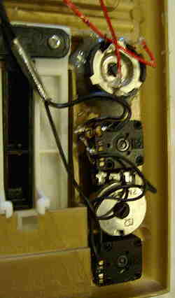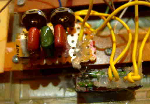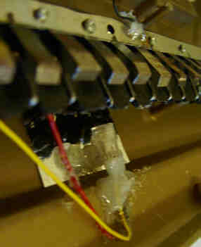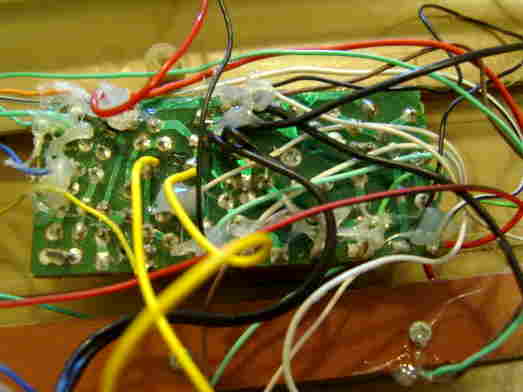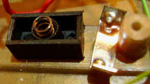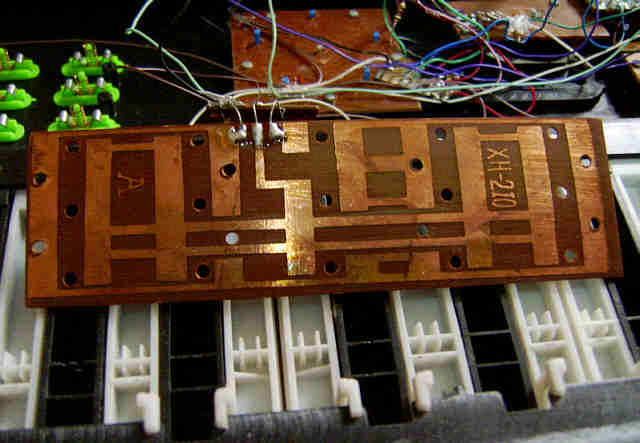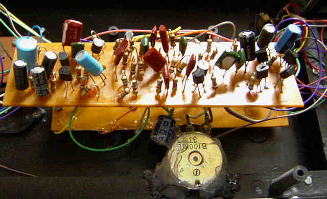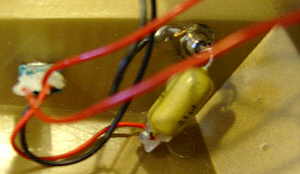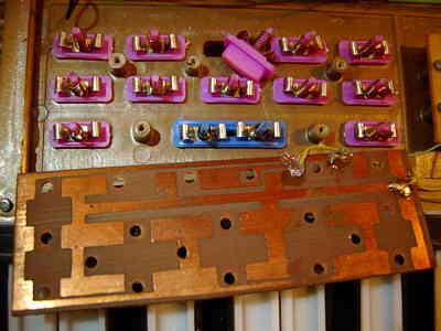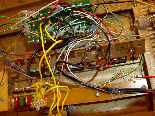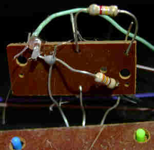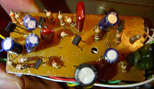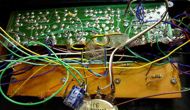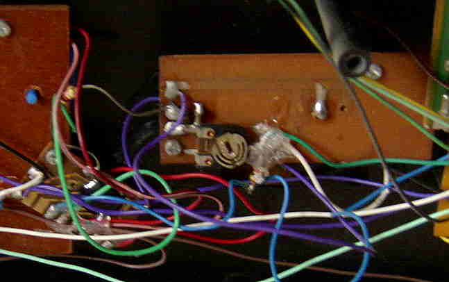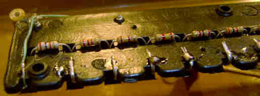 hand- bent and soldered very crude tin leaf switches and resistors underneath).