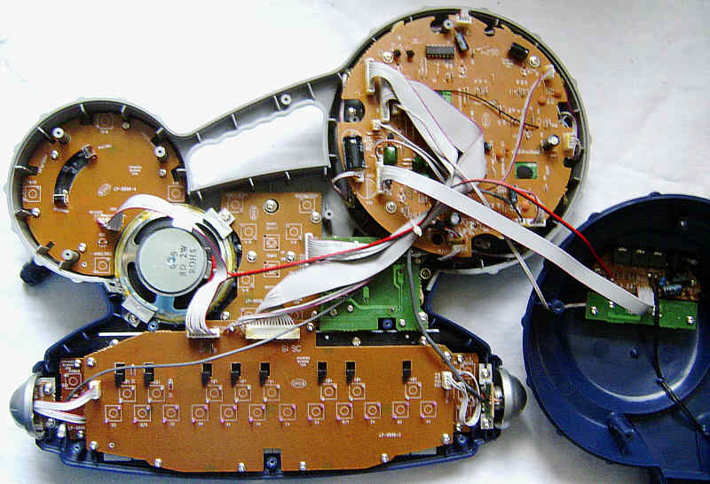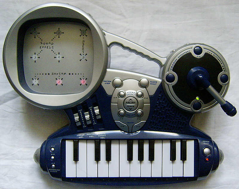 What's that? - is this an extraterrestrial lawnmower with built-in kitchen sink? No, it is a toy groovebox keyboard made in 2004 (printed PCB date) by Lollipop Industrial Limited, with plenty of sound effect samples and lo-fi background preset music pattern loops. Instead of drumpad buttons it employs optical touch sensors and can even store a 5 seconds short lo-fi sample.