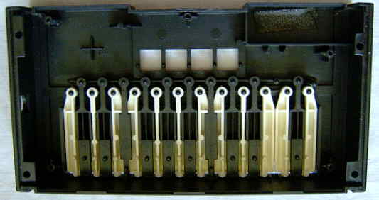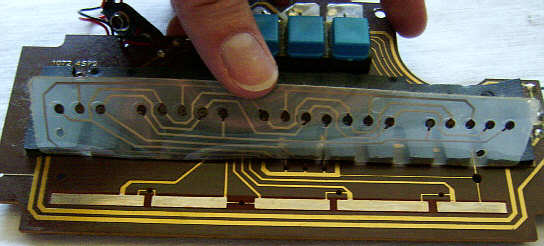The preset rhythm buttons switch the rhythm after 1 step (i.e. almost immediately) and there are various strange glitches those permit fill-in- like live play tricks. So long any single preset rhythm button is held, the instrument plays the low conga in a loop. Holding 'disco' + 'pop' plays the hihat in a loop while holding any other 2 preset rhythm buttons mutes the rhythm (plays silence in a loop). Interesting with the POKEY hihat loop is that you can well hear how the shift register waveform changes its timbre every beat. Rhythms are started with either their OBS buttons or with the tempo button. But the tempo button apparently only sets the tempo to zero when it stops a rhythm, because the next press on the tempo button does not start the pattern from beginning but from where it stopped, and after power on it starts no rhythm at all because none was selected yet. Pressing any button (while none is held) apparently restarts the internal rhythm tempo oscillator when it was previously halted with the tempo button. Thus when you stop the rhythm with the tempo button while any rhythm buttons are still held, you can not restart the rhythm until you first release all buttons.