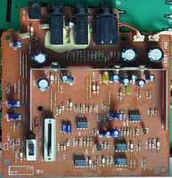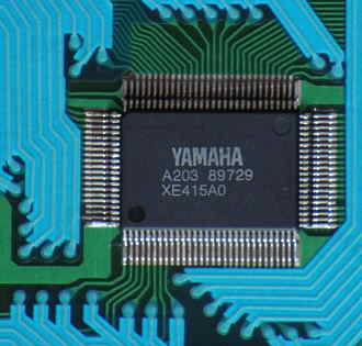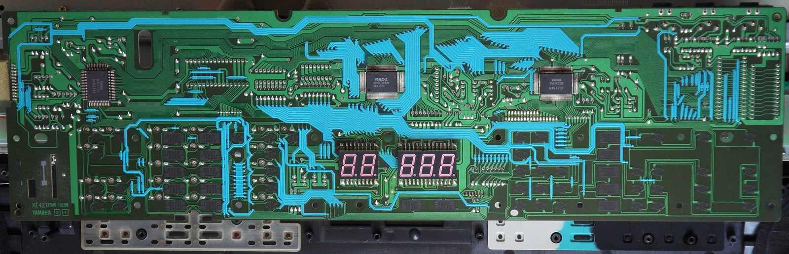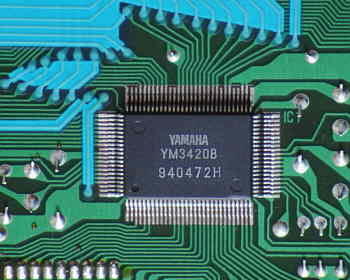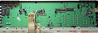 Most parameter are changed by pressing a corresponding select button and then change the value with 2 small black "value" +/- rubber buttons, those are badly visible. (These buttons can not be used to quickly step through the 100 voice bank, which is annoying.) Due to these buttons also edit FM parameters and the main voice volume, it would be interesting to solder in a digital rotary endless controller (a knob with a mouse- like optical encoder and a few 74LS ICs for direction sensing) for this function, because this way also any of the FM parameters would become controllable in realtime during performance. (The +/- buttons react well on rapid single presses, and only switch into fast counting mode when held down longer. Pressing both +/- buttons resets the parameter to default.)