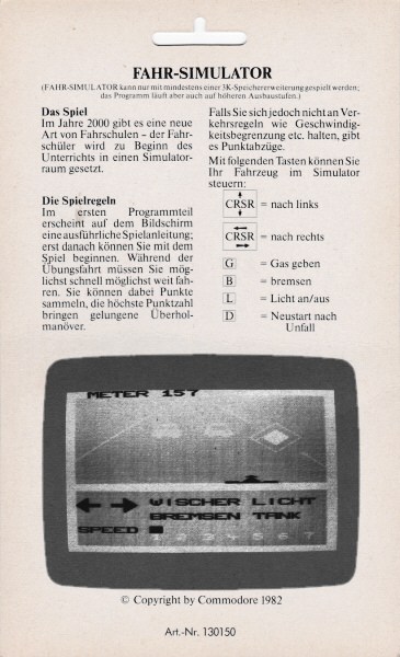 Fahr-Simulator (VC20)The driving simulator hype was popular enough that in 1982 even Commodore jumped on the bandwaggon with a crude VC20 game.