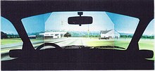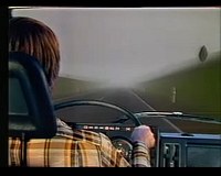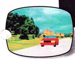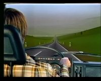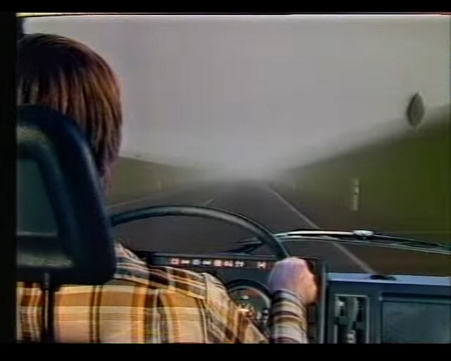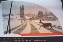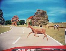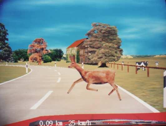 Below the screen on the cabinet was a row of ca. 4 (?) small buttons those allowed to switch between a mountainous and a flatter landscape (could be selected during attract mode; the screen panorama instantly changed when pressing these buttons). The mountain landscape had more curves (S curves?) in the road, but there were no up and down effects (unlike "OutRun") in the road graphics. I clearly remember that there were small, brown huts visible in the green background panorama (of the flatter landscape?). Possibly another button selected between good and bad weather (bad was rain?, or ice and snow?). There was also a button to select between a sober and drunk driver (caused a more difficult steering behaviour?). I believe to remember that each selected button was lit yellow (each button had a light bulb in it?), but they may also have been plain white(?) with a yellow LED close to each of them.