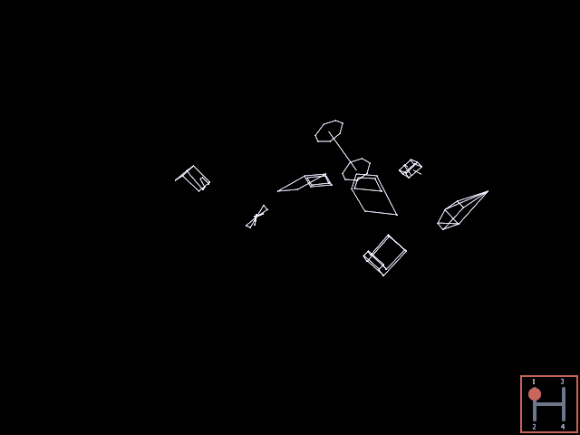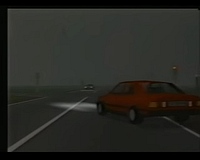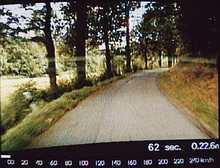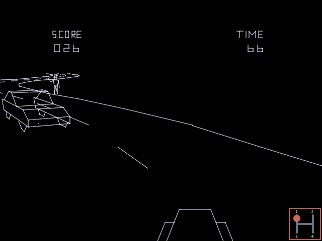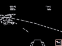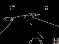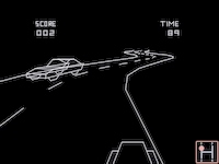 Below the graphics was a black, ca. 4cm high area with very blocky yellow numbers (and a horizontal bar as speedometer?), showed through several rectangular holes in a similar high, plain red, opaque screen overlay (with (white?) writings describing the number fields on it?). There did neither title logos nor copyright messages nor any other writings appear on the screen, only the number stuff below the graphics (similar to some of the first Atari 2600 carts.) Nowadays I guess it was a timed game that played very similar like the Atari's "Night Driver" arcade version on MAME.