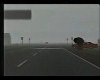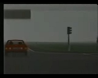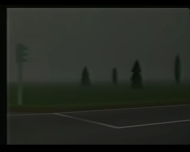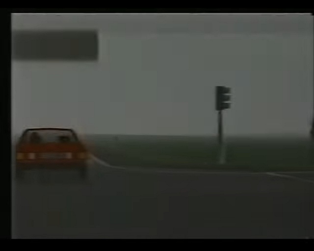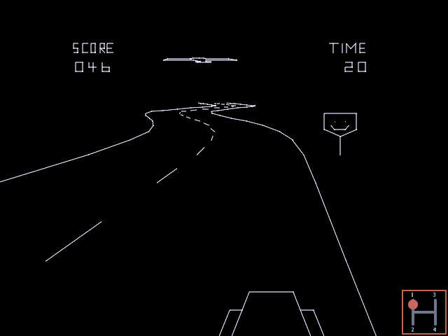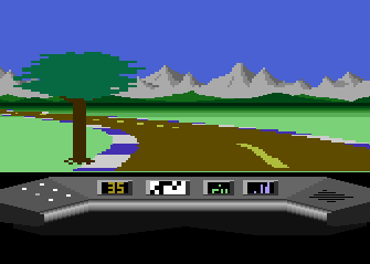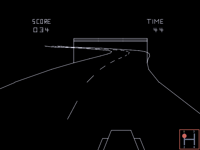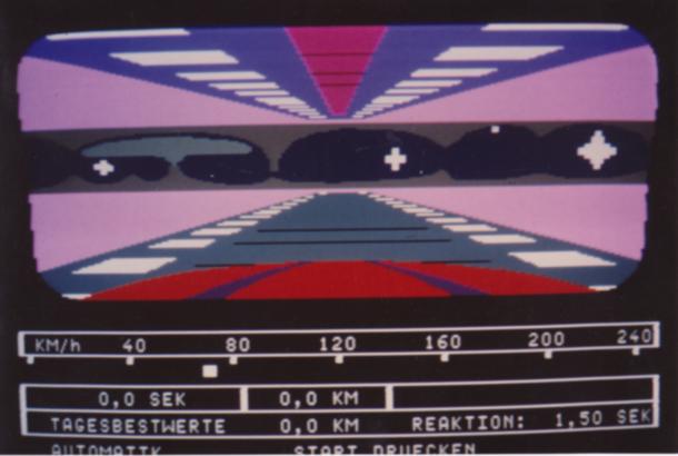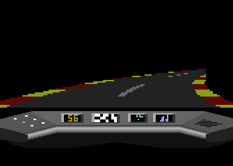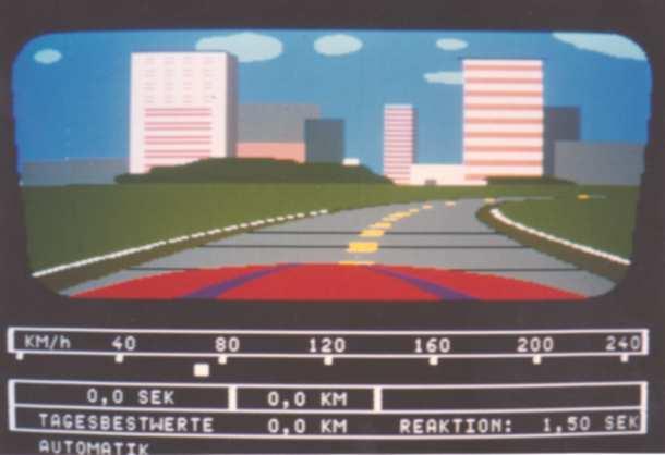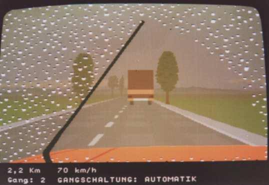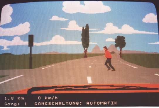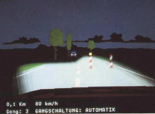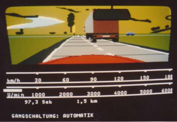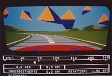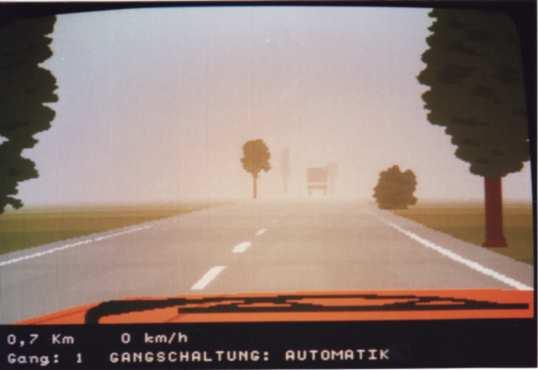 The screen showed in 3D raster graphics (max. 4 or 8 colours per scan line?) a dark blue road with yellow center stripes. You could also see the red (Rolls-Royce/ oldtimer-like) hood of your car there and in the background there was a cloudy sky and a 2D bitmap- landscape (similar like "Pole Position") that scrolled horizontally when passing curves. There were no(!) other cars on the road and I also don't remember any objects left or right to it.