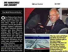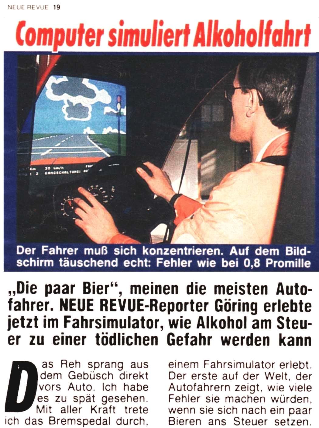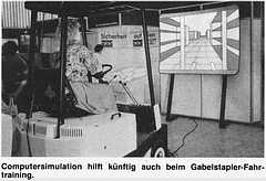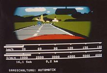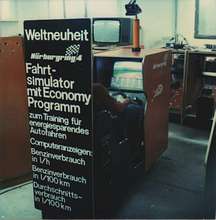 driving simulators were rocket scienceThe technology of driving simulators was derived from flight simulators those existed before. Because driving is less dangerous and cheaper than flight training, expensive simulators were a very rare and exotic niche product only used by science and car developing companies. And since road contact of cars is bumpier than the rather smooth (turbulences aside) turns of aircrafts, motion simulation is more difficult.Jason Torchinsky helped much to investigate the barely documented history of computerized driving simulators. His great essays "Meet The Doctor-Engineer Who Basically Invented The Modern Racing Game" (link) and "VW Invented First-Person Racing Video Games And They Don't Even Know It" (link) revealed more about the origins. He had contacted Volkswagen about their first simulator (VW-Fahrsimulator) that was likely invented around 1972. He got the answer about an article "Die Illusionsmaschine – GM driving simulator kopiert die Wirklichkeit" (The Illusion-Machine – GM Driving Simulator Copies Reality) in the magazine "Automobil Revue" Nr. 52" of 11. December 1969, about a simulator by General Motors that copied the interior of a Chevrolet Nova but was able to copy any other interior of any other car, and that was already the 2nd generation, so there must have been earlier experiments. Apparently it used film projection. Torchinsky finally identified an article in a German trade magazine, "Automobiltechnische Zeitschrift (ATZ)" of February 1974 about the VW driving simulator that first time used computer graphics. VW-Fahrsimulator