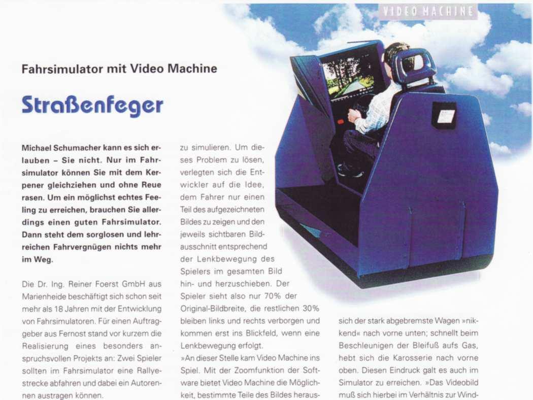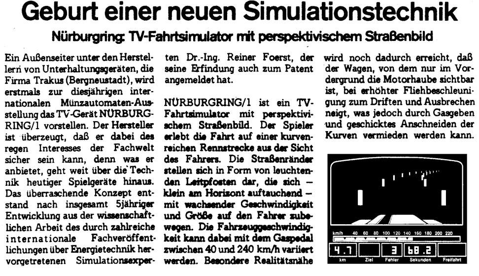 Reiner Foerst died in 2009, and his company "Foerst Fahrsimulatoren" is now managed by his son Kai. In the meantime more info about Nürburgring has appeared on the internet, including the very useful German language company history PDF with many old newspaper articles, pictures and screenshots those helped to assemble this summary about their different early machines and their hardware platforms. On the internet apparently nobody cared to document this groundbreaking piece of videogame and VR history. I also identified related patents those are often the only source to explain the inner working.
