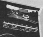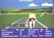 But the interesting part is not the product but its historical context; we all know now where the white on red of the graphics undoubtly got inspired from (and certainly disappointed children those wished something like this for Christmas); it's Nürburgring 3. The VC20 trash game didn't come out of nowhere. While gameplay was lousy, most amazing is its brief background story that at its time was sci-fi: "In the year 2000 there are a new kind of driving schools. To the begin of education the student is sat into a simulator room." Of course there came others. So in 1987 Test Drive by Accolade promised driving simulator thrill at home (even for C64), but despite big onscreen dashboard and rearview mirror this rather jerky car race still suffered of way too repetitive boring graphics. Elektra GlideAlso this spectacular 8-bit homecomputer game of 1985 was obviously inspired by Nürburgring 3. Elektra Glide by Adam Billyard (English Software) has those mountains and blocky numbers, and like there you can not leave the road (despite it has striped rims like Pole Position instead of the crash barrier).