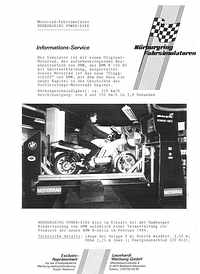 Likely various other versions of the arcade machine were released over time, since the versions on the photo and flyer don't really match my memories, but the video graphics, large steering wheel and gear shift lever match well, and the flyer says that the machine could be optionally ordered with side decals (those may have shown the remembered white chequered flags). The seat I remember may even have been a tractor seat (shaped like a wide bicycle saddle of black sheet metal) bolted to the coin door of this upright Nürburgring 3 machine. Although the screen graphics on the flyer is B/W, the colours of the flyer background picture (yellow stripes, red hood with tank lid etc.) match my memories of the screen colours in the colour version. Thus a successor with colour CRT apparently used the same colours. However the flyer shows no mountain horizon, which I apparently saw in a different version.
