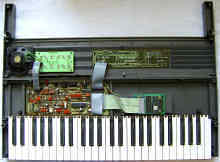 Instead of 2 MIDI jacks there is only a single 5 pin DIN jack labelled "serial in-out" and on the keyboard is a function "serial rate" that can be switched between "MIDI" and "RS232". Likely it could be connected through special cables either with a PC serial port or MIDI devices, but I haven't tried this yet. (Does anybody know more about this?) The predecessor Antonelli 2381 had only a walkman type jack for a PC serial port. I was told by e-mail that the serial port could be used with the Sound Buggy MIDI cartridge for Commodore C64 and a cassette with music learning software made by Siel.