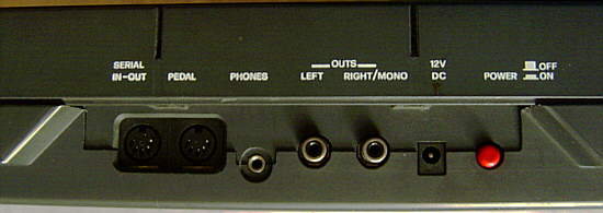 The chord sequencer behaves much like in 2495 and is similarly awkward to use. The "mode" button cycles between "record" and "play" (LEDs lit). To record chords, press it once ("record" is lit and the rightmost 5 keys are mute, including the rightmost key labelled "sequencer write"). Play the single finger chords one by one, and while holding each chord, press and release the "sequencer write" key to store it. Each press of "sequencer write" adds one bar of chord (i.e. press it multiple times to store longer chords). Press "mode" again ("play" is lit now) to finish. To play it, press "mode" until "play" is lit and then start a rhythm. The chord sequence will now repeat in a loop. You can still try to play manual single finger chords during this, but they are cancelled by the next chord of the automatic sequence. With the "patterns" button you can cycle between 2 additional single finger chord sequences (LEDs "1", "2"), those seem to be fixed ROM presets (their LEDs always go out when sequencer "record" or "play" mode is selected).
