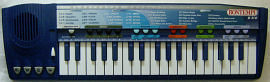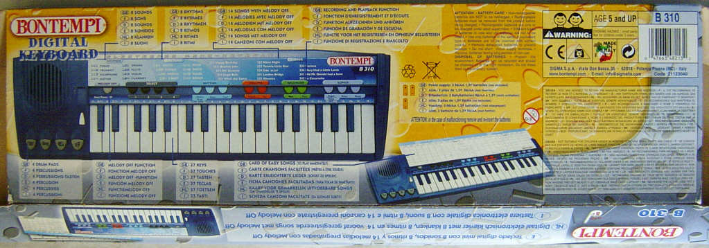 This blue mini keyboard is a modern successor of Bontempi B30. Although the case looks similar, the functions are very different. It has only each 8 preset sounds and rhythms, but 14 lovely arranged polyphonic demo melodies.