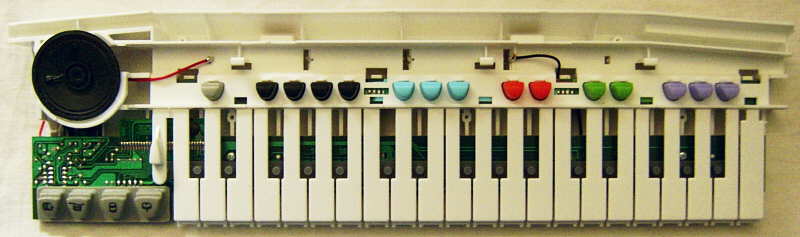 Although it is 2 note polyphonic, a keyboard flaw often makes both channels cancel out each other during fast play, which makes polyphonic play almost unusable. All sounds are based on low resolution loop samples. There is also a primitive monophonic sequencer. The percussion can be played through 4 drumpads and includes a remarkable metallic cymbal. The tiny speaker sounds very thin and bassless; its unique timbre somehow remind to an oboe; it distorts nicely during polyphonic play, which can be used as a sound effect.